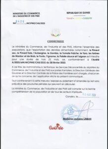 Ledit Communiqué indique que les administrateurs territoriaux, les services déconcentrés du Ministère du Commerce, de l’industrie et des PME aux postes frontaliers, la direction générale des Douanes et la direction centrale de la police des frontières sont chargées chacune à ce qui la concerne de l’application stricte du présent Communiqué.