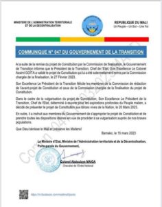 Près de trois semaines après la réception du projet de Constitution par la Commission de finalisation, le président de transition, le colonel Assimi Göita a annoncé la validation du texte dans un communiqué publié par le Gouvernement, le mercredi soir. « Le Colonel Assimi Goita a validé le projet de Constitution qui lui a été solennellement remis par la Commission chargée de la finalisation, le 27 Février 2023 », a informé le communiqué signé le Ministre d’Etat, Ministre de l’Administration territoriale et de la Décentralisation, Porte-parole du Gouvernement, le col Abdoulaye Maïga.