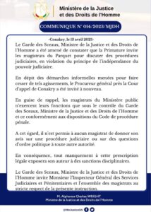 Dans le dit communiqué, le garde des sceaux souligne qu’en dépit des démarches informelles menées pour faire cesser de tels agissements, le Procureur général près la Cour d’appel de Conakry a été invité à nouveau.