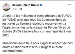 « J’exhorte les militants et sympathisants de l’UFDG, de l’ANAD ainsi que tous les Guinéens épris de justice et de liberté à répondre massivement à l’appel à manifester lancé par les Forces Vives de Guinée (FVG) à travers leur communiqué du 3 mai 2023. Mobilisons-nous tous pour exiger le respect de nos droits et libertés et le retour diligent à l’ordre constitutionnel. ».