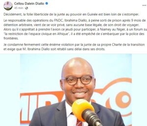 Je condamne fermement cette énième violation par la junte de sa propre Charte de la transition et exige que M. Ibrahima Diallo soit rétabli sans délai dans ses droits », a écrit Cellou Dalein Diallo sur sa page Facebook