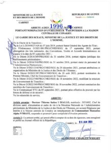 Docteur Thierno Sadou I DIALLO, matricule: 3051692, Chef de division santé, alimentation et cadre de vie à la Direction Nationale de l’Administration pénitentiaire du Ministère de la Justice et des Droits de l’Homme qui a été nommé Régisseur par intérim à la Maison centrale de Conakry.