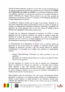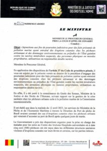 Ces navires minéraliers et les responsables sont poursuivis pour des faits présumer de pollution maritime ayant entrainé des éruptions cutanées chez les pêcheurs artisanaux et des dommages environnementaux au préjudice de l’Etat guinéen contre les navires minéraliers suspectés, des personnes physiques ou morales propriétaires, utilisatrices ou responsables desdits navires.