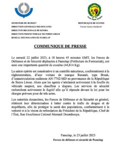 Il s’agit plus précisément de 44,814 kg. La saisie s’est déroulée hier samedi 22 juillet 2023, selon le ministère du budget, à bord d’une voiture de marque Renault immatriculée en République sœur du Mali au numéro AN-7262-MD en provenance de la Sierra Léon, selon un communiqué officiel.