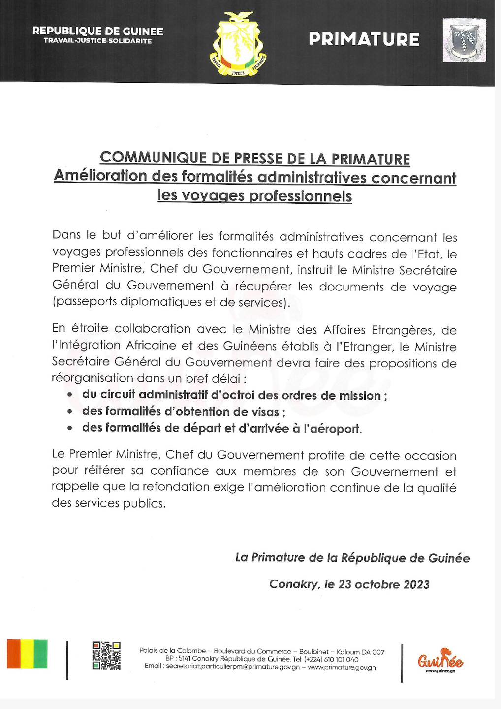 Dans un communiqué publié dans la journée du lundi, 23 octobre 2023. Le Premier Ministre, Dr Bernard GOUMOU a instruit le Ministre Secrétaire Général du Gouvernement à récupérer les documents de voyage (passeports diplomatiques et de services) des fonctionnaires et hauts cadre de l’Etat.