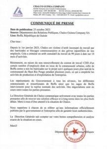 Après un arrêt temporaire suite aux perturbations des travaux et des soulèvements des communautés qui a occasion un congé technique de plusieurs employés, la société Chalco informe à travers ce communiqué que les négociations sont en cours avec toutes les parties prenantes.