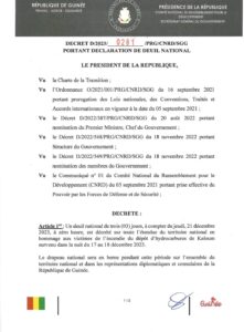 Suite à l’incendie survenu dans la nuit du 17 au 18 décembre 2023 au dépôt d’hydrocarbure de la Société Guinéenne des Pétroles (SONAP) à Kaloum, le Président de la Transition annonce un deuil national de trois jours.
