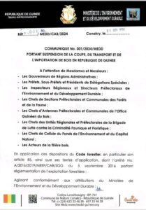 Dans un communiqué publié ce mercredi, 05 juin 2024, sur la page officielle du Ministère de l’Environnement et du Développement Durable, la Ministre Djami Diallo annonce que les activités de coupe, de transport et d’implantation de bois sont suspendus sur toute l’étendue du territoire national à compter du 05 juin 2024 jusqu’à nouvel ordre.